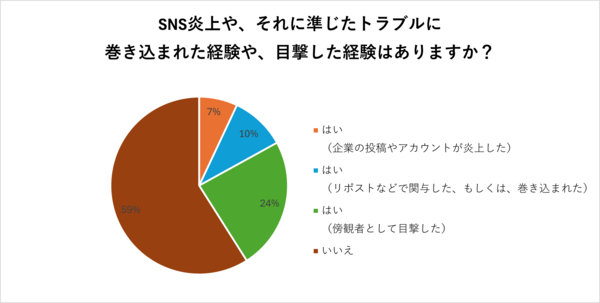 内訳は「はい(企業の投稿やアカウントが炎上した)」と回答した人(当事者)が7%、「はい(リポストなどで関与した、もしくは、巻き込まれた)」と回答した人(関係者)が10%、「はい(傍観者として目撃した)」と回答した人(目撃者)が24%となりました。