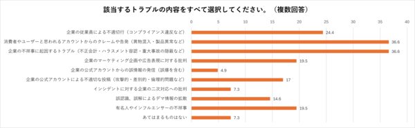 トラブルの内容としては、「消費者やユーザーと思われるアカウントからのクレームや告発(異物混入・製品異常など)」「企業の不祥事に起因するトラブル(不正会計・ハラスメント容認・重大事故の隠蔽など)」が36.6%で同率1位となっています。