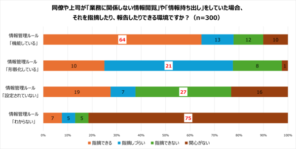具体的には、情報管理ルールが「正しく機能している」と回答した人は、不正行為を「指摘できる」とする回答が多く、情報管理ルールが「形骸化している」と回答した人は、「指摘しづらい」と回答する傾向があり、情報管理ルールが「設定されていない」と回答した人は、「指摘できない」と回答する割合が高くなっています。