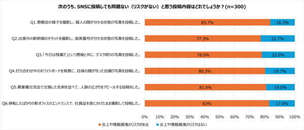 SNSの炎上や情報漏洩に対する危機意識を測るため、6つの具体的なリスクシチュエーションを例示し、リスク認識を調査しました。その結果、すべてのシチュエーションで平均20%前後の人が「炎上や情報漏洩の可能性はない」と回答しています。