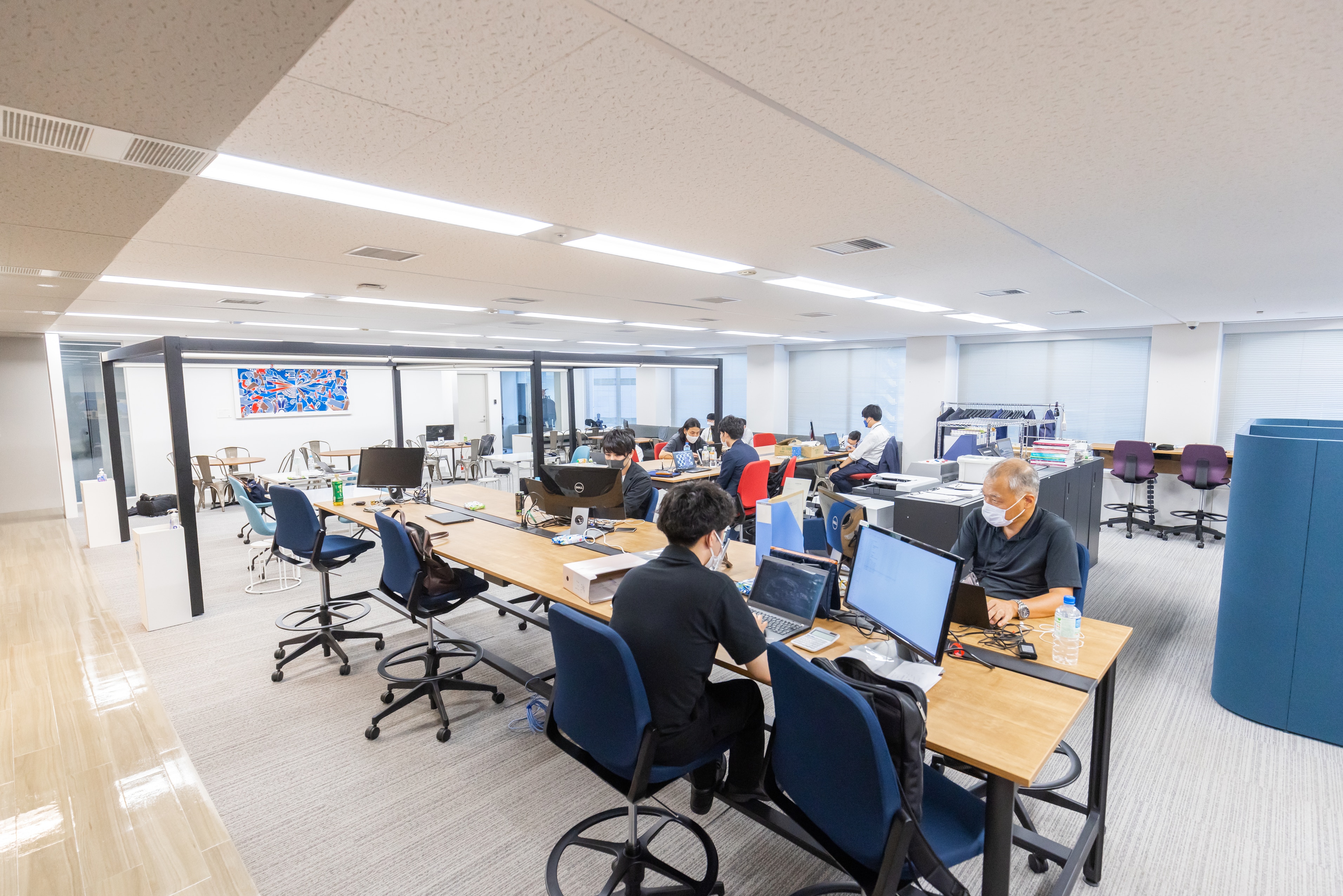 業務エリアは全面フリーアドレスとなっており、 社員同士がコミュニケーションをとりやすい環境です。